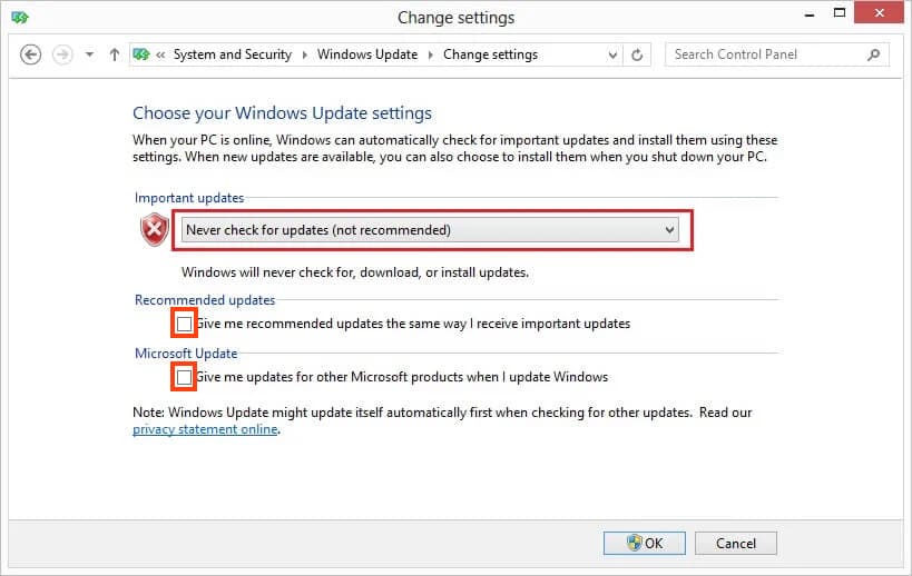 — Under “Important updates,” select “Never check for updates (not recommended)”. Also, uncheck the two options below and click “OK” at the bottom.