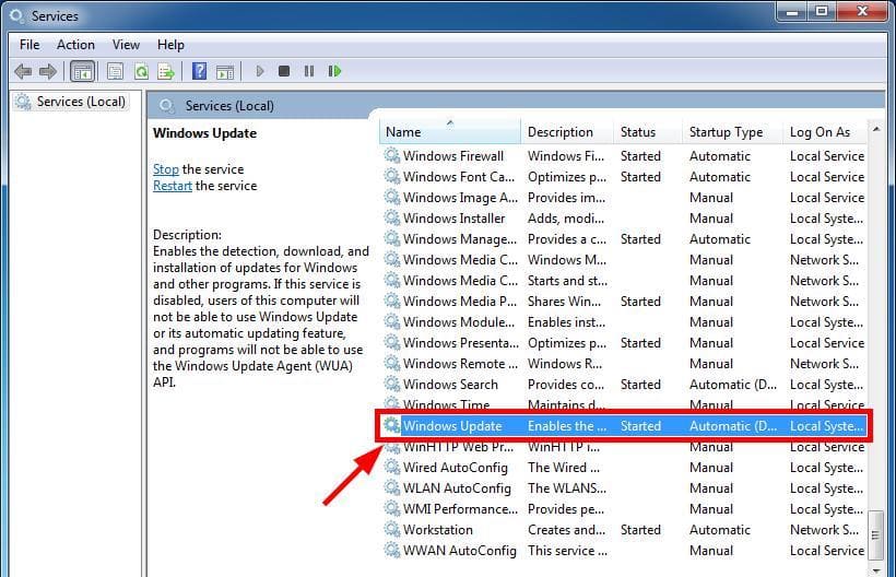 — Scroll down and find “Windows Update”, double click on it to open the service.