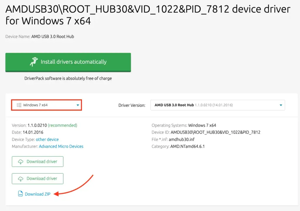 5. Select your Windows version and download the provided ZIP archive with the driver.