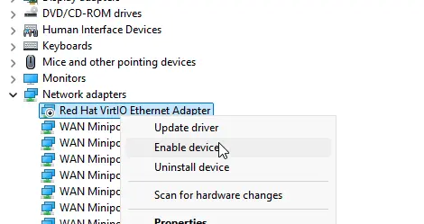 4. Ensure the network adapter is enabled in Device Manager. Disabled devices are marked with a small downward arrow icon. Enable the device if necessary.