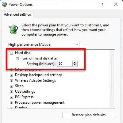 2. In Power Options, ensure the Hard disk section is set to turn off after 20 minutes, and in the Sleep section, Wake timers are disabled.