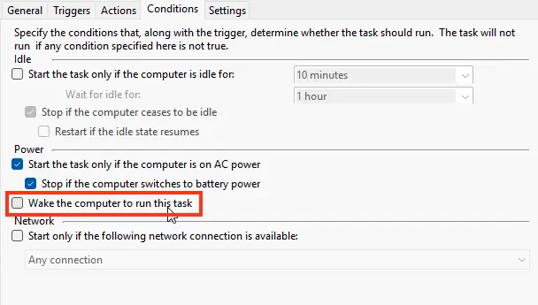 2. If you have a task like npcapwatchdog in the Task Scheduler Library, go to its properties, and on the Conditions tab, uncheck Wake the computer to run this task.