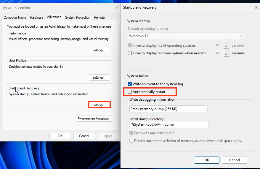 1. Disable automatic restart on system failure: Search for SystemPropertiesAdvanced.exe, go to Startup and Recovery > Settings, and uncheck Automatically restart.