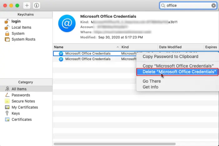 To resolve this issue, use the Keychain Access application to delete all password entries containing “Office”. Follow these steps: