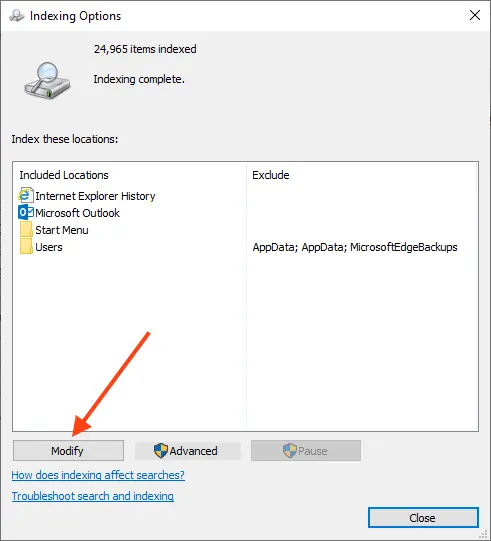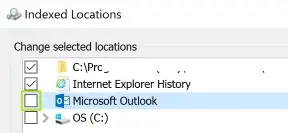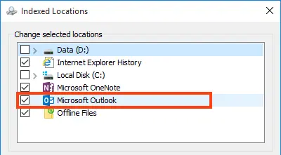 8. Return to Indexing Options and re-enable Microsoft Outlook.