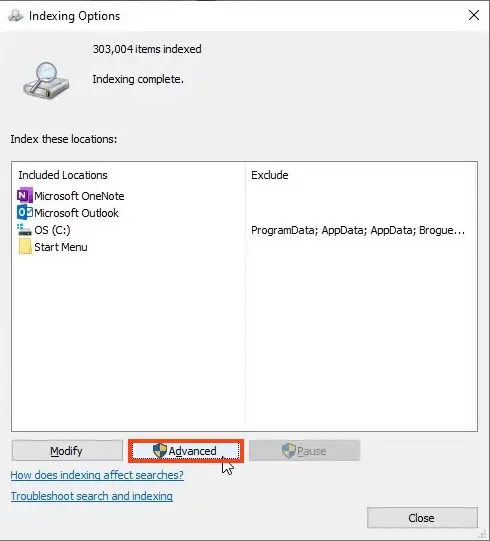 2. Click Indexing Options > Advanced.