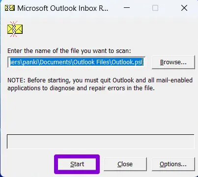 3. Run scanpst.exe and point it to the PST or OST file path.