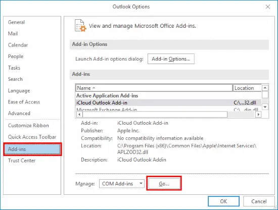 – In Outlook go to File > Options > Add-ins.