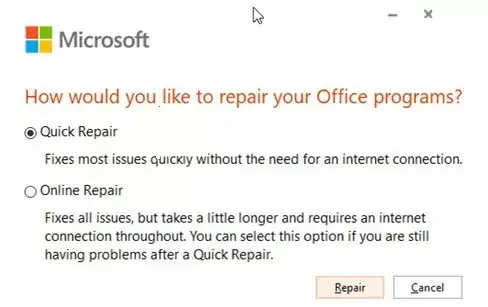 – Choose Repair and follow the wizard.