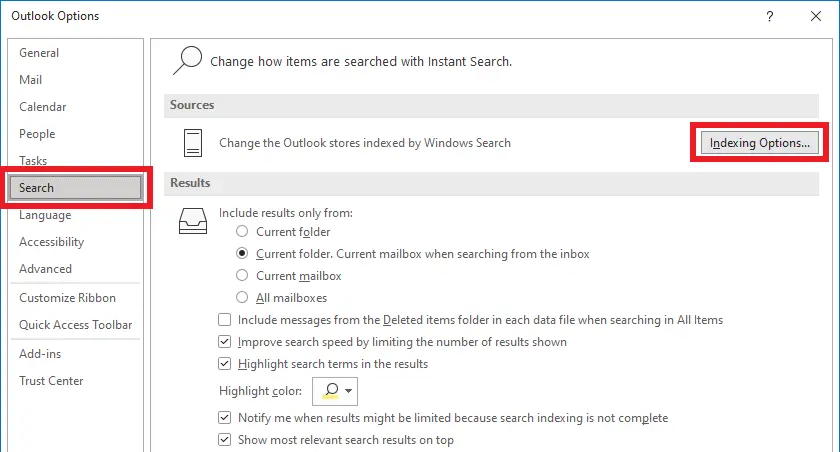 1. In Outlook go to File > Options > Search.