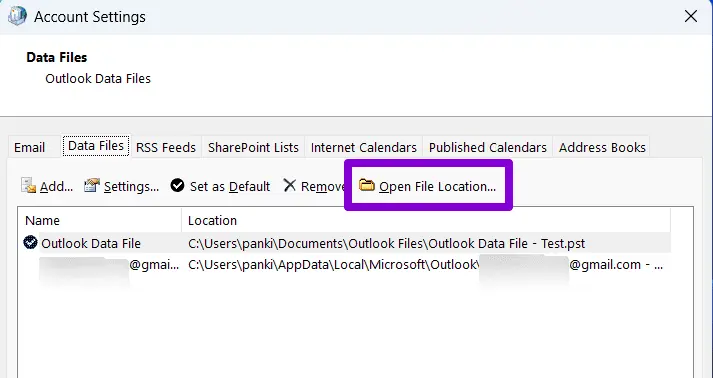 – On the Data Files tab select a data file and click Open File Location.