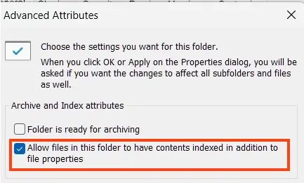 – Click Advanced and enable “Allow files in this folder to have contents indexed in addition to file properties.”