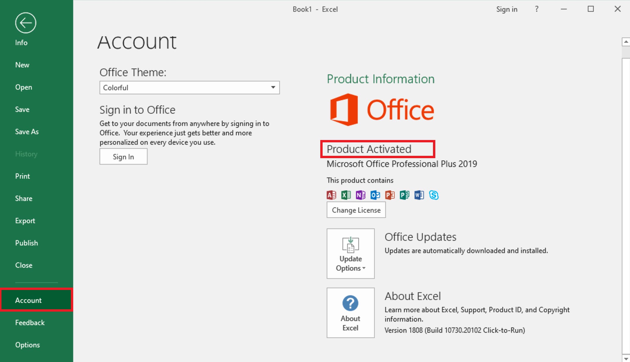 7) After successful activation, your Microsoft Office 2019 will be ready to work! You can check the activation from the “Account” menu.