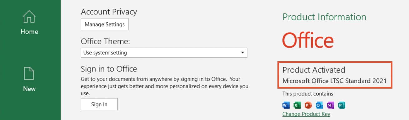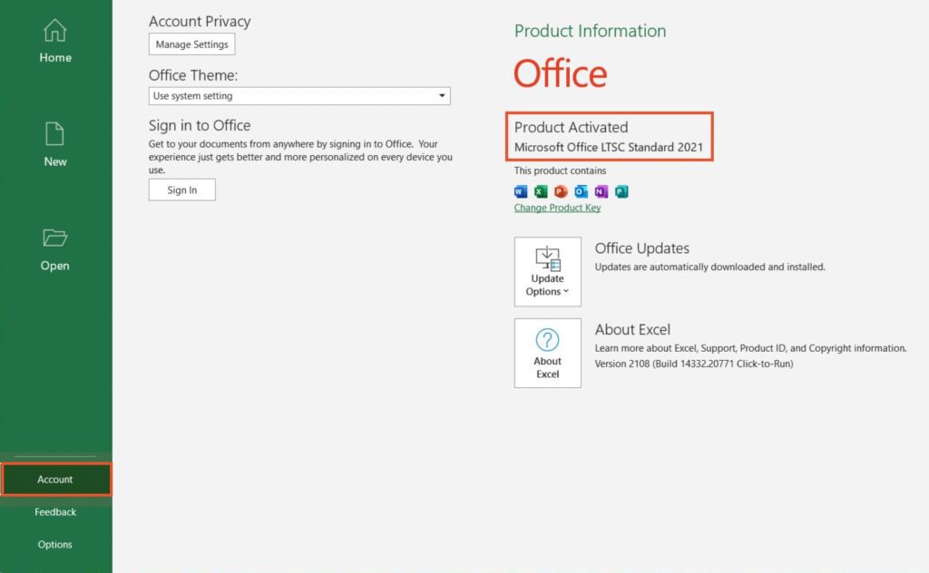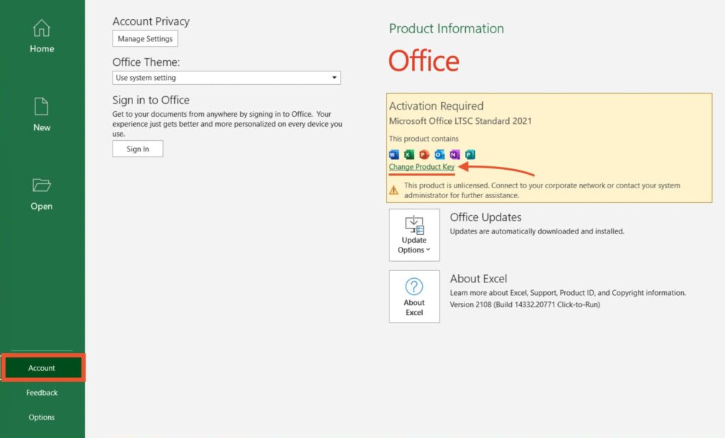 Next, select the “Account” section and click “Change Product Key” to activate Office 2021 LTSC Standard.