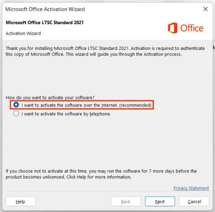 10) Select “I want to activate the software over the Internet. (recommended)” and click “Next”