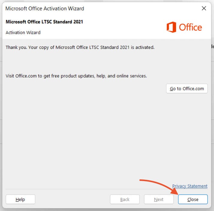 11) Close the Microsoft Office Activation Wizard
