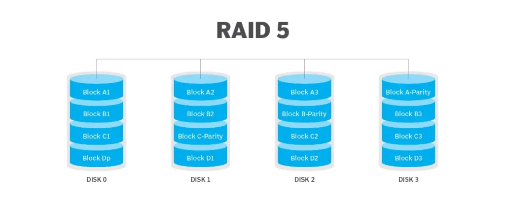 – Efficient Storage Use: Only one disk’s capacity is used for parity, making it more space-efficient than RAID 1.