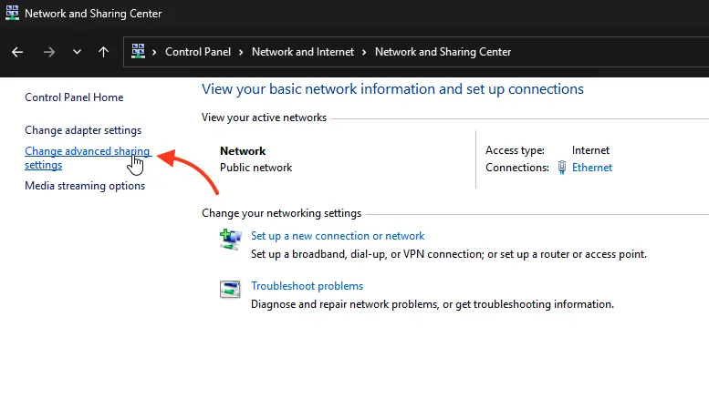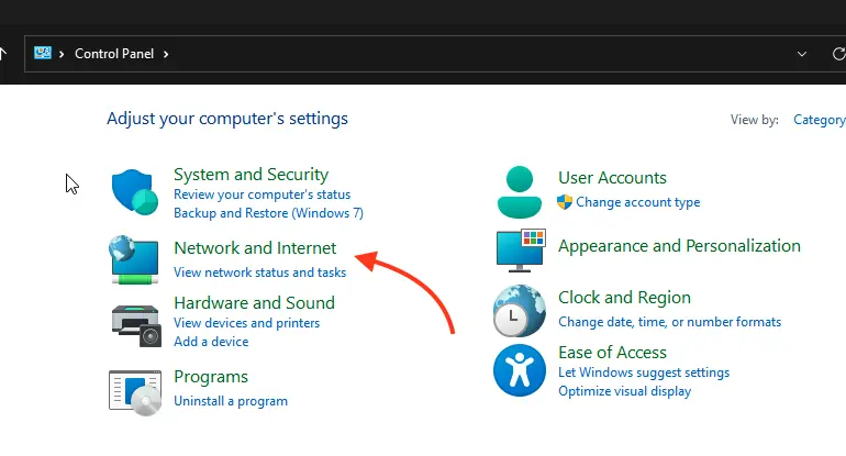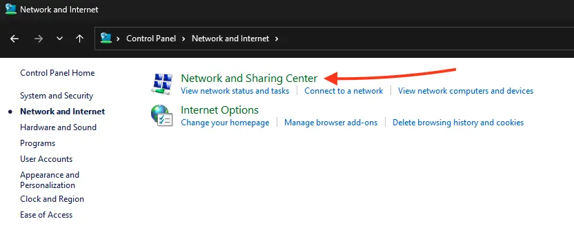 2. Navigate to Network and Internet → Network and Sharing Center.
