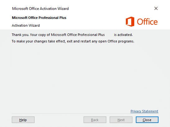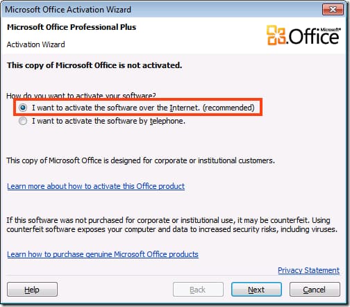 10) When you open it for the first time, the Microsoft Office activation wizard will appear. Select online activation and click “Next”.