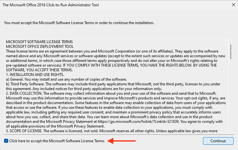 10) Accept the license agreement, check the box next to “Click here to accept the Microsoft Software License Terms.”