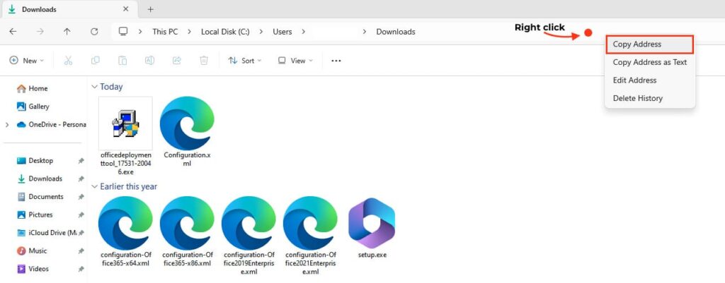 12) Now we need to copy the path to our folder where all the files we downloaded and extracted are located. Go to your folder (in my case it is “Downloads”) and right-click in an empty space next to its path. Then click “Copy address.”