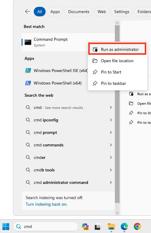 13) Next, go to “Start” and type “cmd” in the search. Right-click and run the command prompt as administrator.