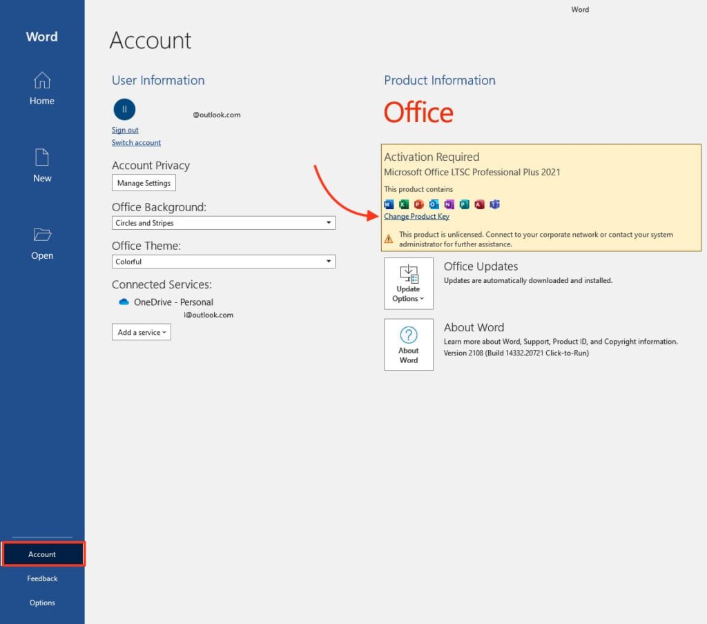 – Go to the “Account” section and select “Change Product Key.” If you do not have a Microsoft account, instructions on how to create one are available on our website.