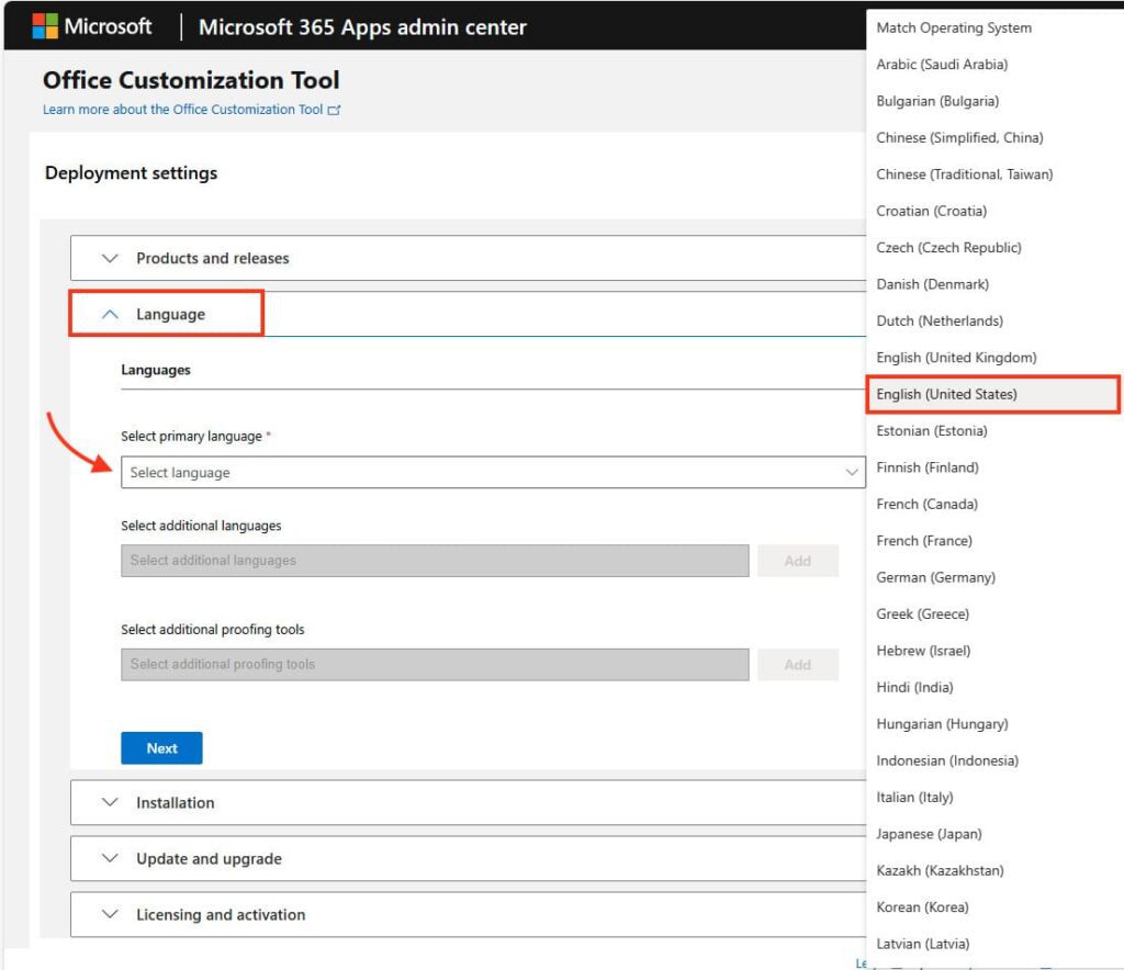 5) Then go to the “Language” section and select the primary language, in our case it is English.
