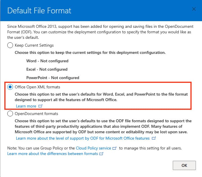 7) Select the format, in this case, we need XML. Check the box next to “Office Open XML formats” and click “OK.”