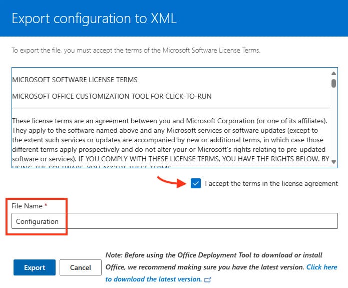 8) Accept the terms and name the XML file Configuration. Then click “Export” and save the XML file in the same folder where you previously downloaded the Office Deployment Tool (ODT).