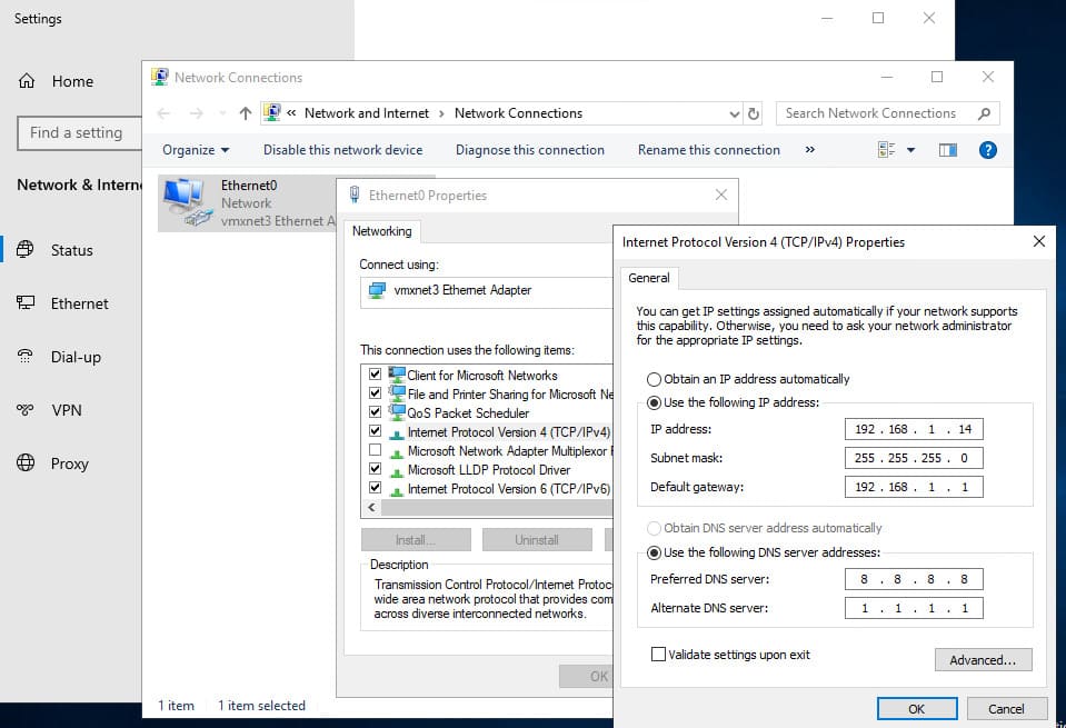 1. Configure the network. Assign a static IP address to the server. Specifying a DNS server at this stage is optional—during the domain controller setup, the DNS service will be installed and will automatically update the DNS settings. It’s recommended to disable IPv6, though this can be done post-installation.