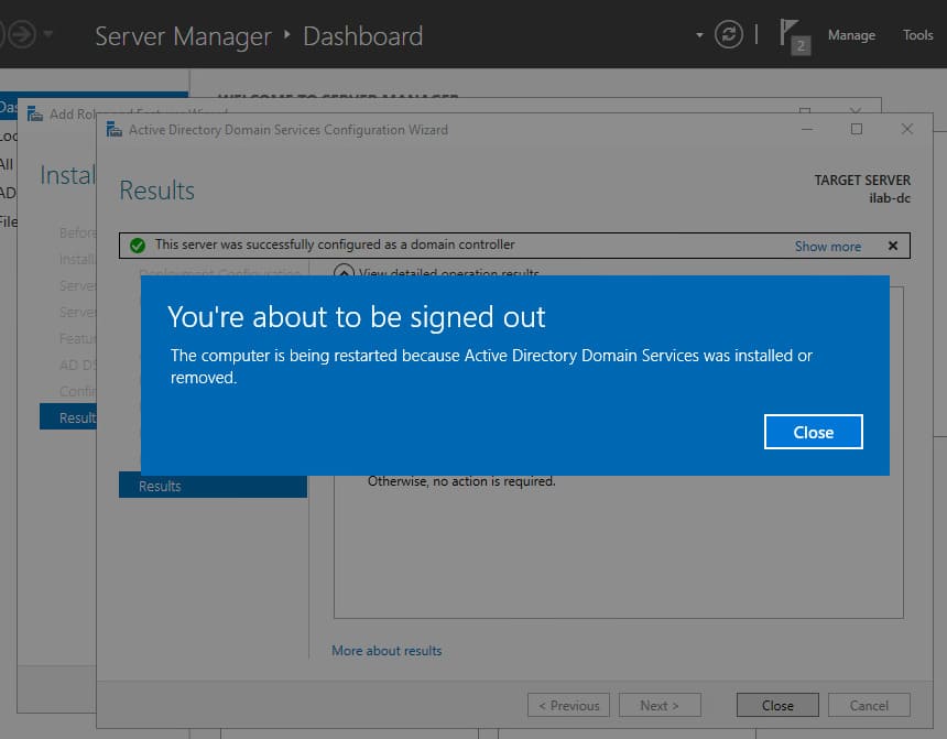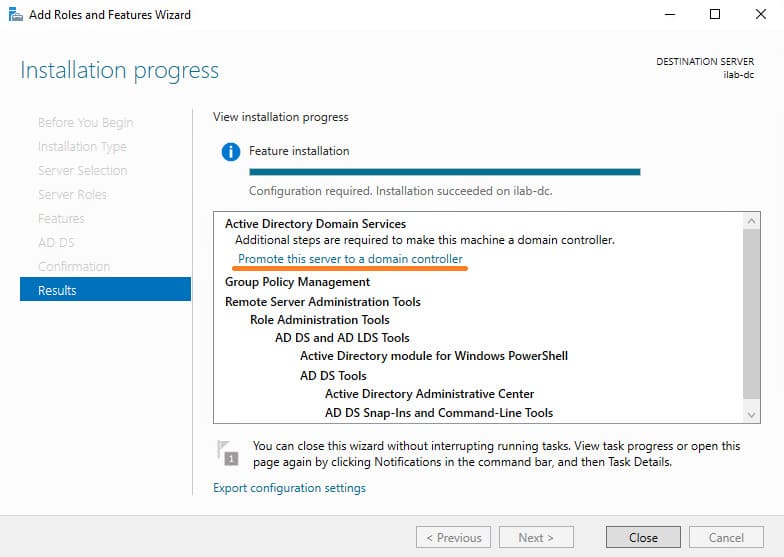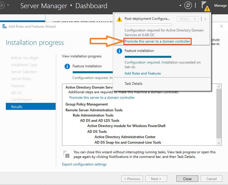11. Once the installation is complete, a message will indicate that the server needs to be configured to be promoted to a domain controller. Click Promote this server to domain controller.