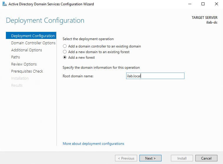 2. Specify the root domain name in the Root domain name field (e.g., “ilab.local”) and click Next.