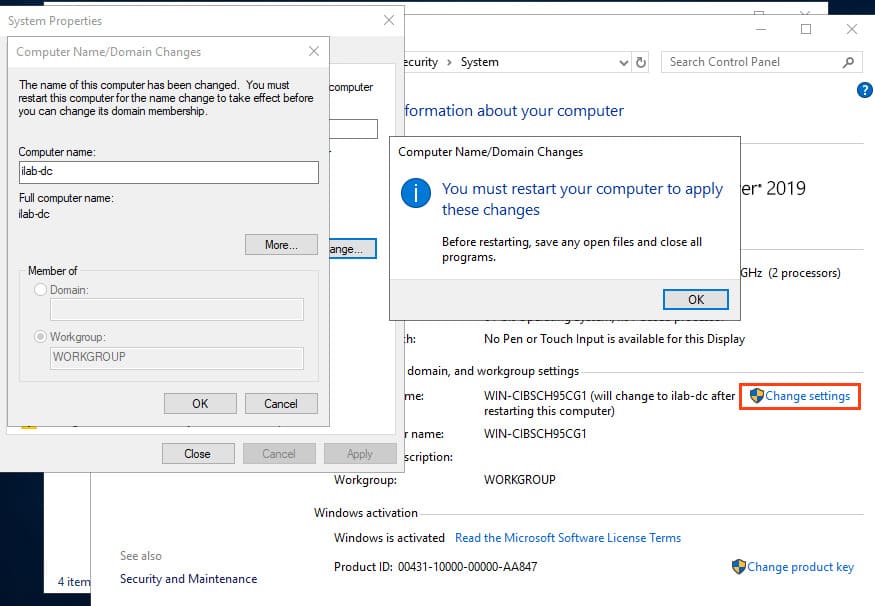 After installing Windows Server 2019, perform the initial system configuration: