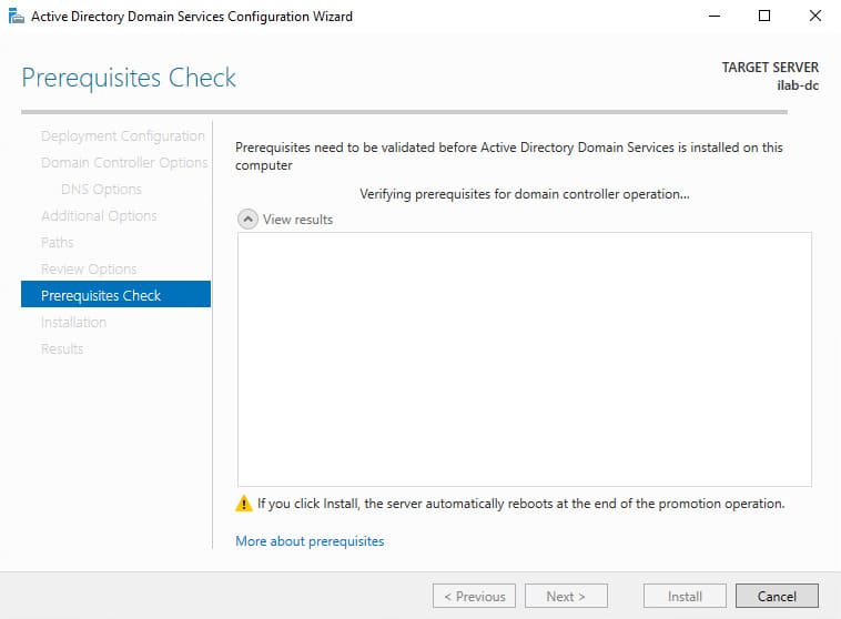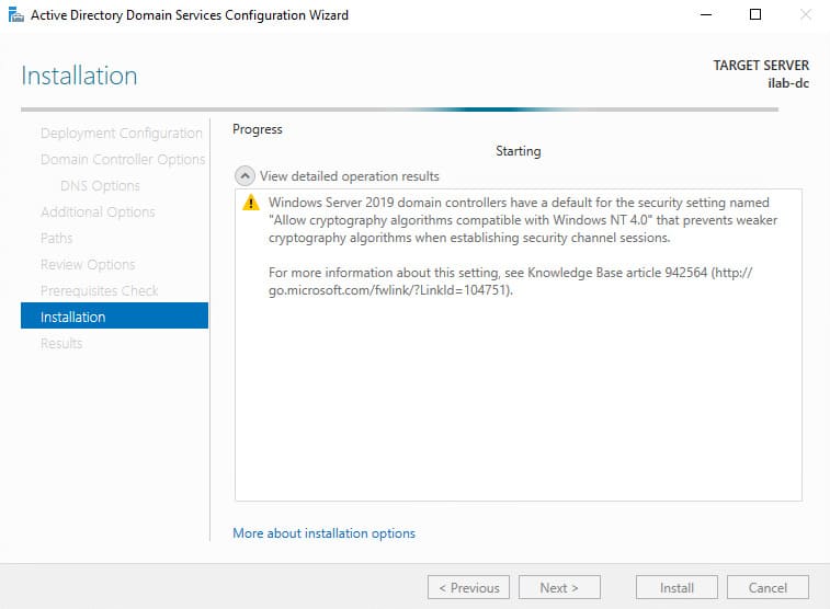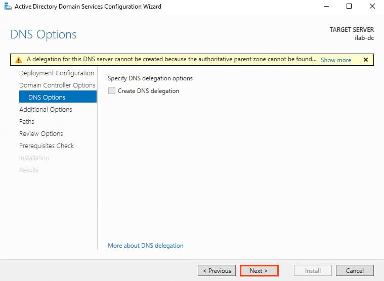 6. In the Additional Options section, specify a NetBIOS name for the domain, e.g., “ILAB”. Click Next.