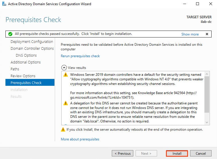 9. In the Prerequisites Check section, the wizard will perform checks. If all prerequisites are met, click Install to begin the installation.