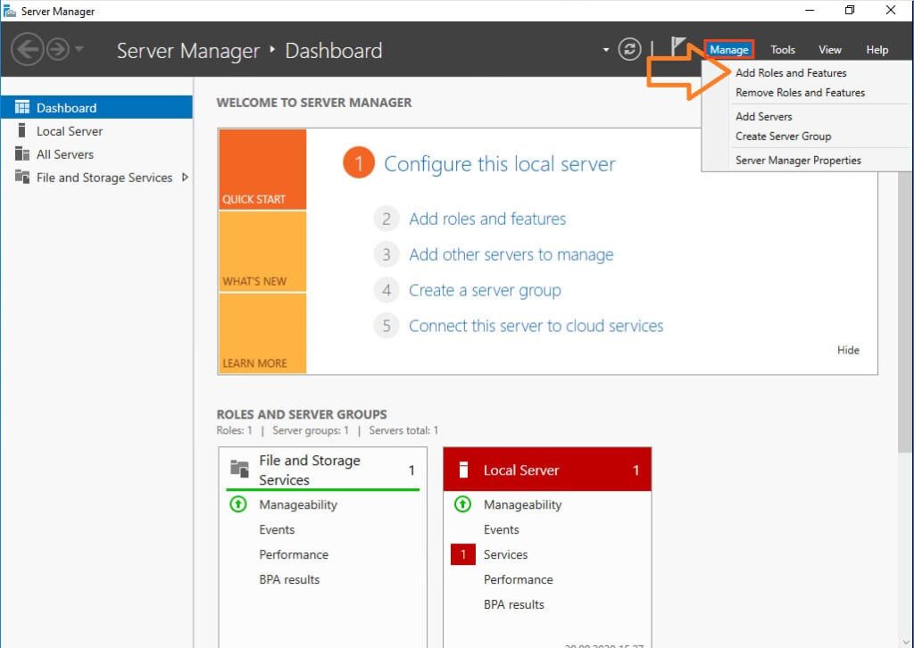 1. Open Server Manager and navigate to Manage > Add Roles and Features.