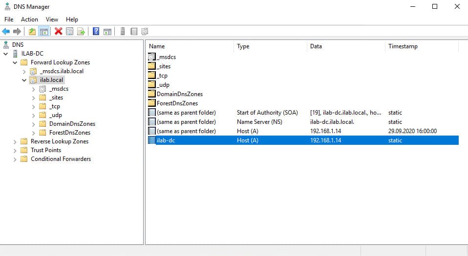 2. Verify that the DNS server is automatically configured and that the domain zone (e.g., “ilab.local”) has been created.