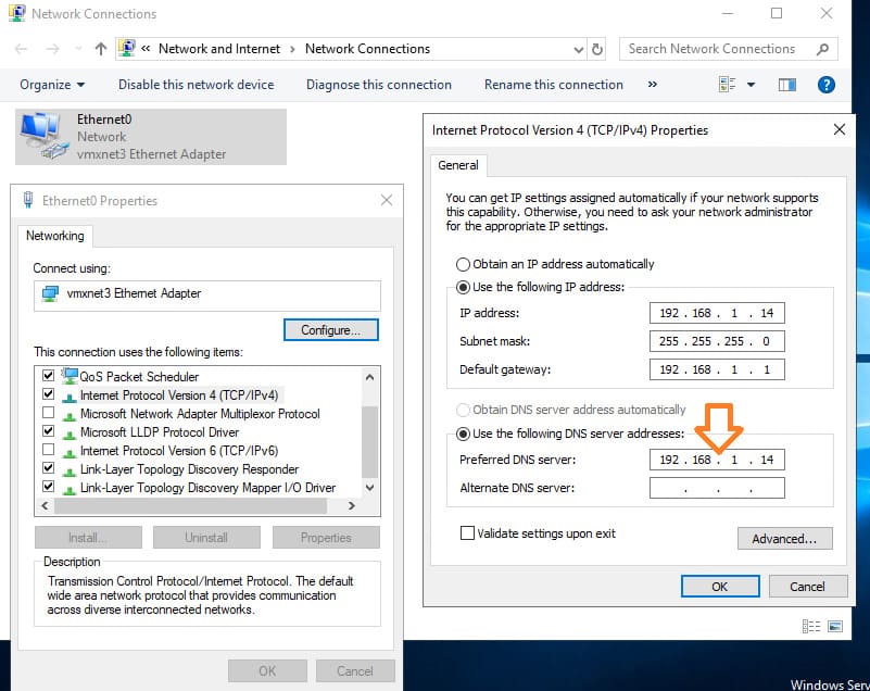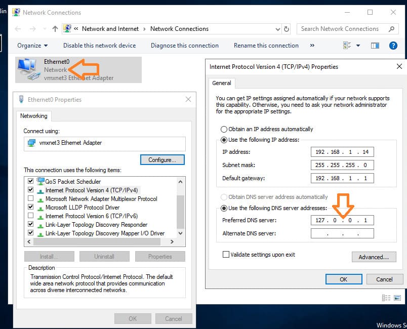 3. If the network adapter’s DNS server is set to 127.0.0.1, change it to the static IP address of your domain controller.