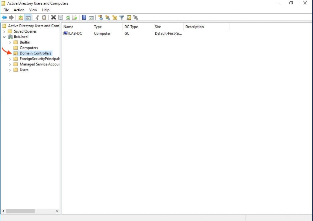 1. Open the Active Directory Users and Computers snap-in. The domain controller will appear in the Domain Controllers section.