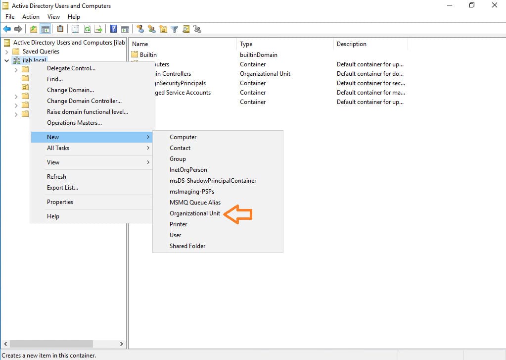 2. Create a new organizational unit (OU) for your company. Right-click the root directory and select New > Organizational Unit.