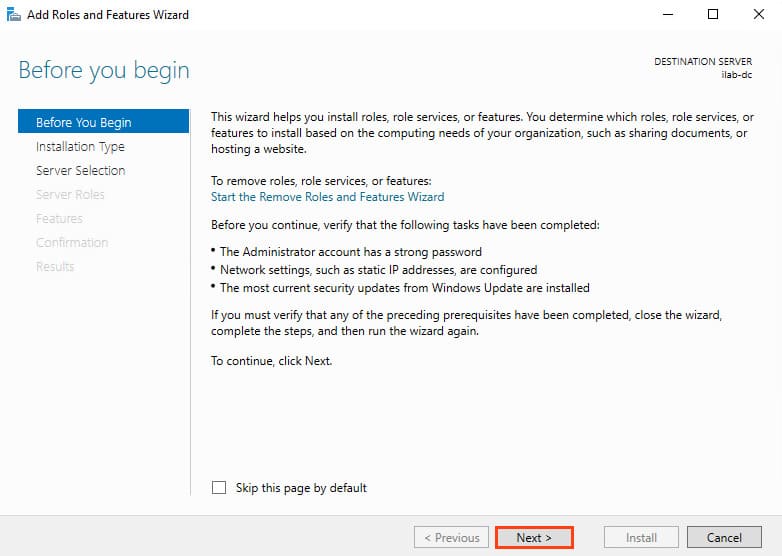 2. The Add Roles and Features Wizard will launch. On the Before You Begin step, click Next.