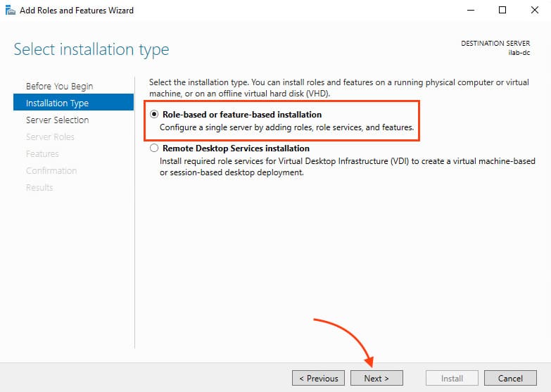 3. In the Installation Type section, select Role-based or feature-based installation and click Next.