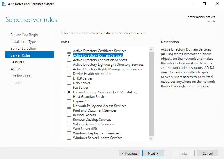 5. In the Server Roles section, check the box for Active Directory Domain Services.