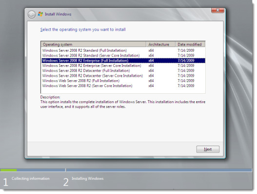 Next, select the desired version for installation. In this example, we’ll choose the most comprehensive version, Windows Server 2008 R2 Enterprise (full installation), but you can choose any version you prefer. The installation process will be the same regardless.