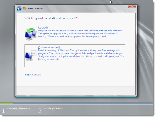 Since this is a clean installation from scratch, choose “Custom”.