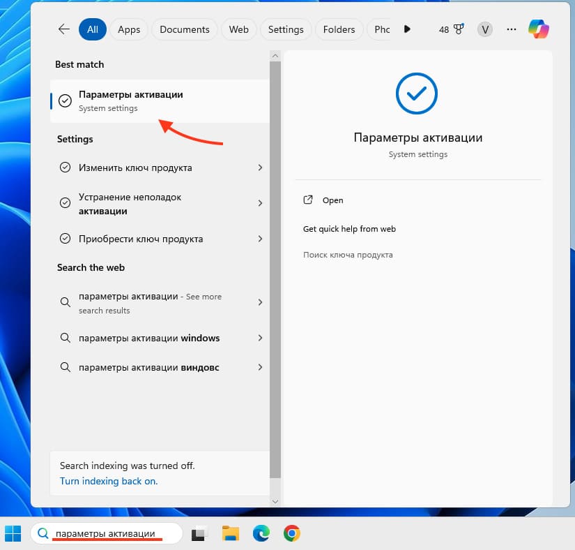 1. Открываем меню “Пуск” и вводим в поиске “Параметры активации”.