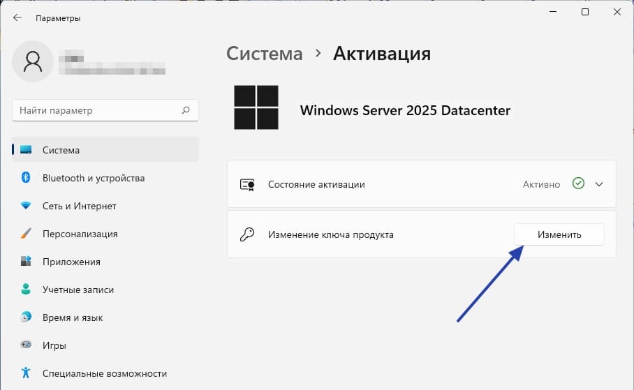 2. В параметрах активации в разделе “Изменение ключа продукта”, нажимаем кнопку “Изменить”.