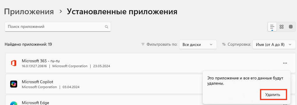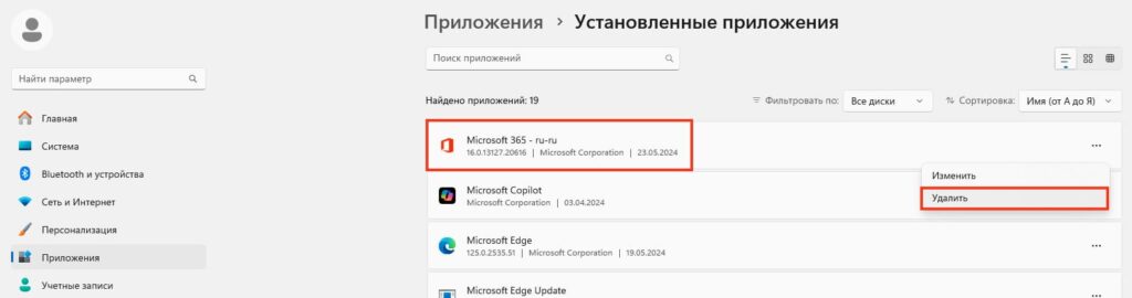 3) Далее найдите Microsoft 365, либо введите в поиске Microsoft 365, щелкните на “троеточие” справа от приложения и нажмите “Удалить”. После чего еще раз нажмите “Удалить”.