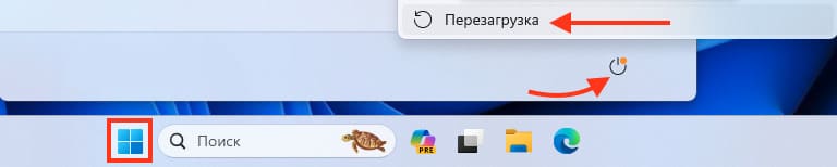 7) Переходим в “Пуск”, Кликаем по иконке отключения компьютера, нажимаем “Перезагрузка”.